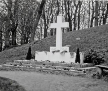Het oorspronkelijke monument uit 1946 bestond uit een houten kruis met een bronzen plaquette. Later werd dit aangepast met zuilen, maar de exacte reden en het moment van deze aanpassing zijn helaas niet gedocumenteerd. In 1952 werd het houten monument verwijderd, waarna dankzij financiële steun van de Stichting Friesland 1940-1945 en een inzamelingsactie onder de bevolking, de plaquette op de Jouster Toren werd onthuld.